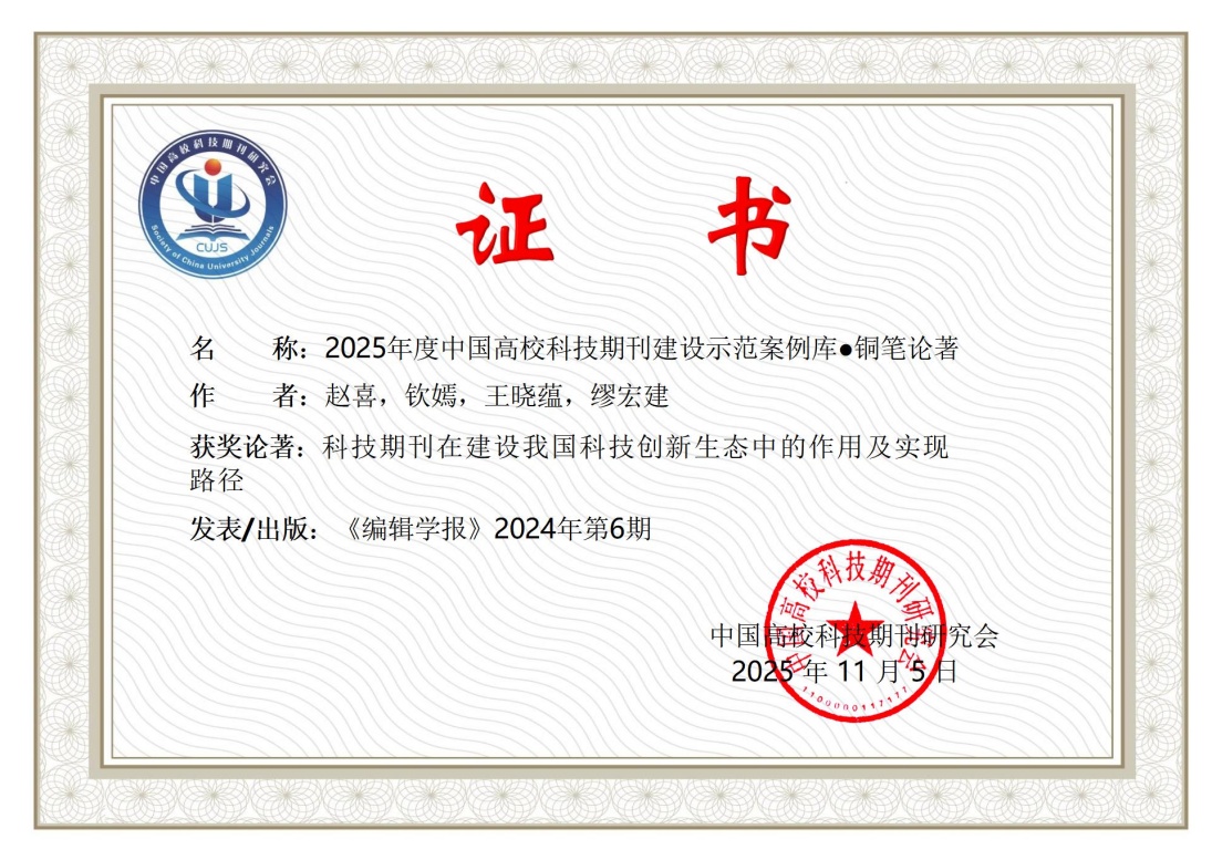 “2025年度中国高校科技期刊建设示范案例库·金笔论著/银笔论著/铜笔论著”结果公布,共征集133篇论文(著作),10篇入库“金笔论著”,20篇入库“银笔论著”,30篇入库“铜笔论著”。 赵喜等作者的论文《科技期刊在建设我国科技创新生态中的作用及实现路径》入库“铜笔论著”。