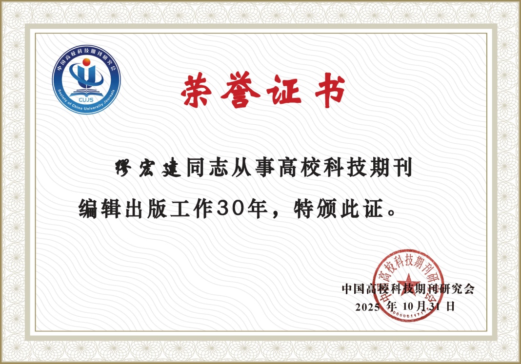 中国高校科技期刊研究会为鼓励高校科技期刊编辑出版工作者爱岗敬业、乐于奉献、开拓创新、不断提高期刊编辑出版质量和学术影响力,向从事高校科技期刊编辑出版工作30年的编辑出版工作者颁发荣誉证书,使他们感受到学会和社会的关心和认同,增强高校科技期刊编辑出版工作的荣誉感和自豪感。